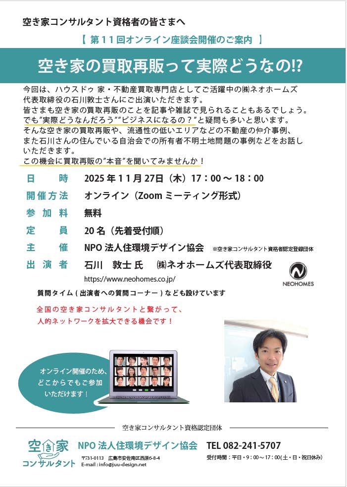 空き家コンサルタント「第11回オンライン座談会」1127日(木)に開催しました。